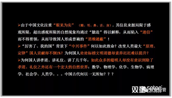 由于中國儒家文化注重“眼見為實”,受限于眼、耳、鼻、舌、身 ,其信息來源局限于感觀所限,從而缺乏純理論、抽象的科學(xué)探索,容易形成“思維遮蔽”的邊界封閉!