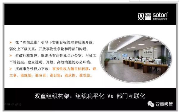 當(dāng)然,團(tuán)隊的意識提升和自我思想“蛻變”才是剛開始。接下來,從2015年開始,“雙童”開始逐步改造行政辦公區(qū),打破員工與管理層之間的行政籬笆,取消董事長和所有高管的獨立辦公室,建立了平等、透明、開放的辦公環(huán)境,所有行政員工都在一起集體辦公,員工與管理層之間平等相處。