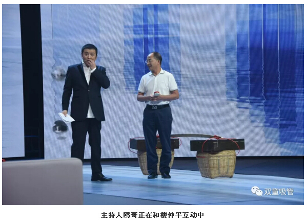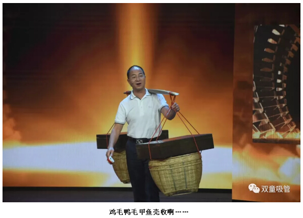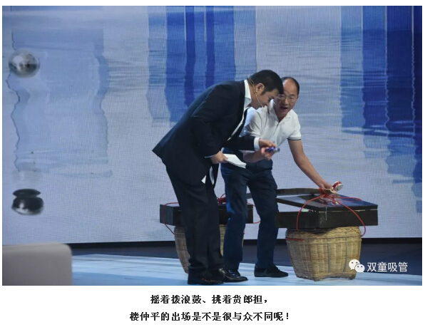 相比于其他兩位嘉賓,“雙童”樓仲平的出場(chǎng)方式可算是最“與眾不同”啦!看,當(dāng)主持人“鷗哥”邀請(qǐng)樓仲平出場(chǎng)時(shí),他竟然搖著撥浪鼓、挑著貨郎擔(dān),口里還喊著“雞毛鴨毛甲魚(yú)殼收啊……”就上場(chǎng)了!