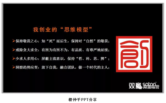 接著,樓仲平用一句話做展開:知“死”而后生。一個企業(yè)唯有始終保持危機感,才能不斷的成長,否則隨時會死掉。我們所有的一切都在大自然的規(guī)律中,在宇宙之下演繹生成。而商業(yè)的本質(zhì)也是基于自然生態(tài)共生規(guī)律下,所以在經(jīng)營當(dāng)中,唯有大家知道了規(guī)律,才會更進一步成長。