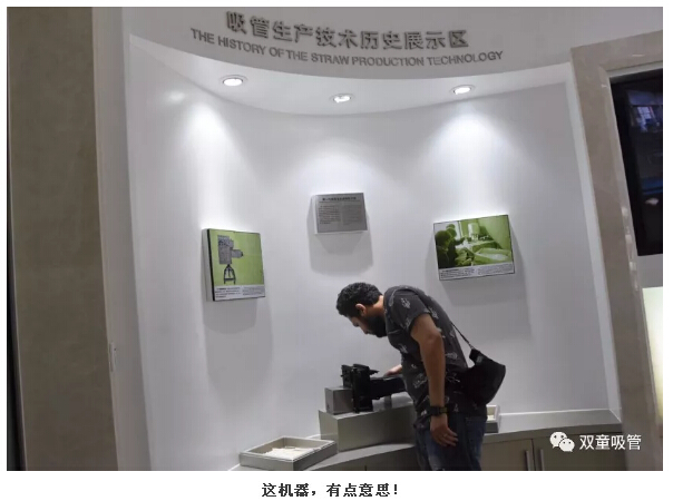 大家正在參觀吸管生產(chǎn)歷史的展示區(qū),這里展示了第一代的吸管擠出機以及可彎曲吸管的制作機器。吸管妹妹介紹后,還有外國友人被中國吸管博物館里展示的制作機器吸引住了,獨自在觀察研究。