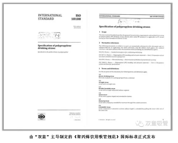 在大多數(shù)人沒有意識到標準的重要性時,“雙童”早在20多年前就意識到標準制定權和行業(yè)話語權的重要性。從1997年開始,“雙童”先后主導起草了《聚丙烯飲用吸管》的行業(yè)標準、浙江標準、國家標準、ISO國際標準等國家級標準的編制工作,從而牢牢掌握住全球吸管行業(yè)發(fā)展的脈搏,獲得了全球吸管產業(yè)的標準制定權和行業(yè)話語權!