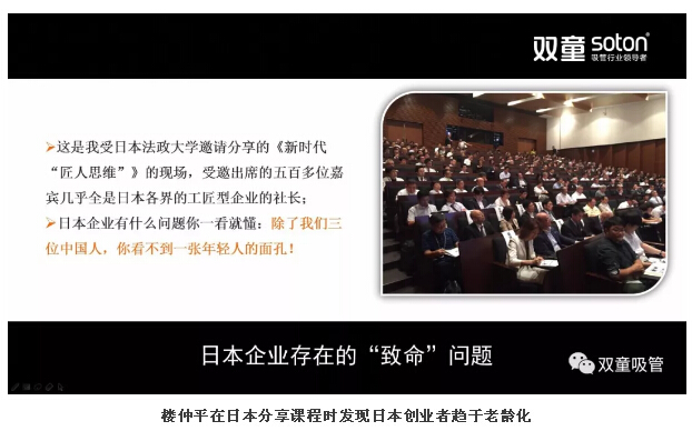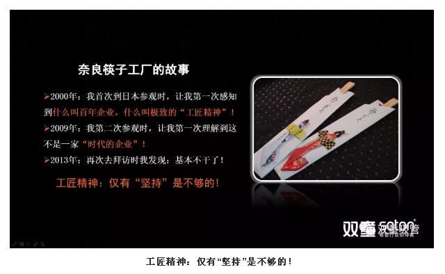 隨后,樓仲平通過(guò)日本奈良筷子工廠的故事(見(jiàn)下方PPT),引導(dǎo)大家認(rèn)知到工匠精神僅有“堅(jiān)持”是不夠的,在時(shí)代巨變下,沒(méi)有什么是可以亙古不變的!