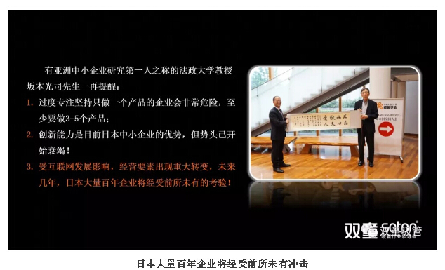 有“亞洲中小企業(yè)研究第一人”之稱(chēng)的法政大學(xué)教授坂本光司先生曾經(jīng)在和樓仲平交流中表示:過(guò)度專(zhuān)注堅(jiān)持只做一個(gè)產(chǎn)品的企業(yè)會(huì)非常危險(xiǎn),一個(gè)企業(yè)想要長(zhǎng)續(xù)生存發(fā)展至少要做3-5個(gè)產(chǎn)品。創(chuàng)新能力是目前日本中小企業(yè)的優(yōu)勢(shì),但勢(shì)頭已開(kāi)始衰竭!受互聯(lián)網(wǎng)發(fā)展影響,未來(lái)幾年日本大量百年企業(yè)將經(jīng)受前所未有的沖擊!