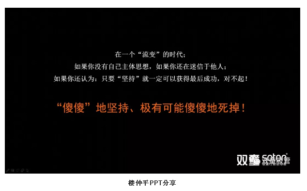 在本章節(jié)的最后,樓仲平更是警醒所有聽(tīng)眾:在這個(gè)“流變”的時(shí)代,如果你還認(rèn)為只要“堅(jiān)持”就一定可以獲得成功,那就極有可能是“傻傻”地堅(jiān)持,傻傻地死掉!唯有與時(shí)代同步,融入互聯(lián)網(wǎng)思維的“新工匠精神”,才能夠在這個(gè)“流變”的時(shí)代下持續(xù)生存發(fā)展!