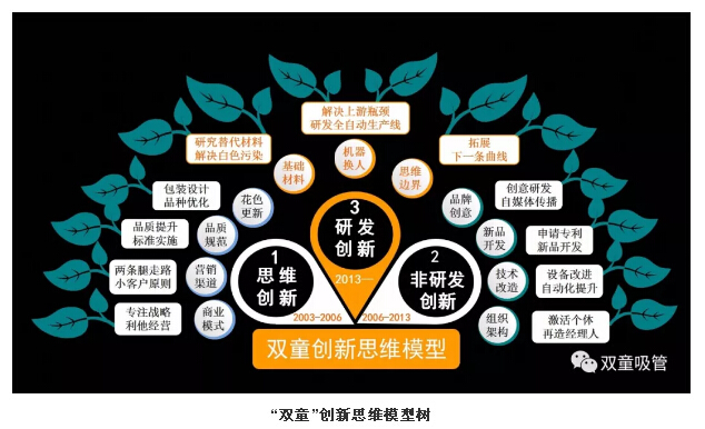 2003年開(kāi)始,“雙童”提出了“兩條腿走路戰(zhàn)略”和“小客戶原則”,走差異化轉(zhuǎn)型路線,進(jìn)行思維創(chuàng)新。同時(shí),“雙童”通過(guò)技術(shù)改造、新品開(kāi)發(fā)、品牌創(chuàng)意等開(kāi)展非研發(fā)創(chuàng)新工作,通過(guò)打開(kāi)思維邊界、機(jī)器換人、研發(fā)可降解產(chǎn)品等開(kāi)展研發(fā)創(chuàng)新,從而促進(jìn)和推動(dòng)企業(yè)的發(fā)展!