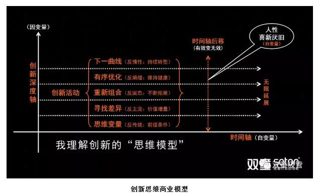 在“創(chuàng)新思維商業(yè)模型”中,X軸是時(shí)間軸,屬于自變量。Y軸是創(chuàng)新深度軸,屬于因變量。在這個(gè)模型里面,創(chuàng)新活動(dòng)分為五個(gè)層次,越往上走,說(shuō)明企業(yè)的創(chuàng)新深度越深;越往后走,說(shuō)明隨著時(shí)間的增長(zhǎng),原來(lái)有效的創(chuàng)新活動(dòng)變成無(wú)效,需要持續(xù)創(chuàng)新,無(wú)窮無(wú)盡……