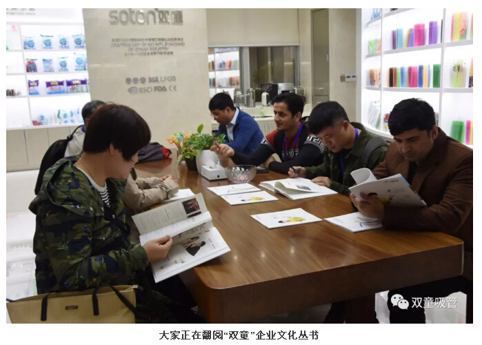 來到“雙童”吸管產(chǎn)品陳列廳后,大家翻閱了桌上的企業(yè)文化叢書,有記者問道:“我太喜歡你們公司的企業(yè)文化了,能送我一本嗎?”看來,大家都被“雙童”的企業(yè)文化吸引啦!