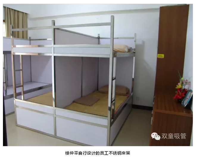 “雙童”員工集體寢室的不銹鋼床架可是參觀團(tuán)隊(duì)最津津樂(lè)道的話題之一!這些床架都是由“雙童”樓仲平自行設(shè)計(jì),在建造之初就把床架焊在地上。這樣一來(lái),即避免產(chǎn)生垃圾死角,床下又多了一個(gè)封閉的儲(chǔ)物空間,確保員工在生活方面的便利舒適!