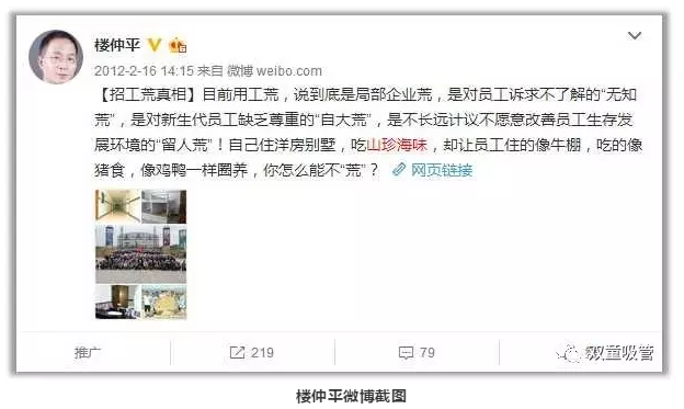 其實(shí),“雙童”樓仲平由于早年坎坷辛苦的創(chuàng)業(yè)經(jīng)歷,一直對(duì)農(nóng)民工感同身受,十分注重員工的吃住問(wèn)題。早在2012年,樓仲平就發(fā)布了一條關(guān)于員工住宿的微博,引起了極大的關(guān)注。微博上寫(xiě)道:自己住洋房別墅,卻讓員工住的像牛棚狗窩,你怎么能留得住員工?員工是企業(yè)的基礎(chǔ),對(duì)員工更好、企業(yè)反而會(huì)獲得更多!