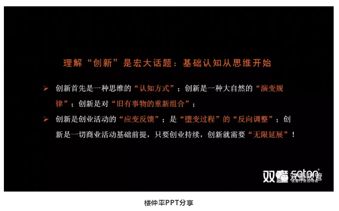 原來,正是因?yàn)椴粩嗟膶W(xué)習(xí)提升,樓仲平自身的思維也發(fā)生了轉(zhuǎn)變。他的課程也從最初的創(chuàng)業(yè)經(jīng)歷分享轉(zhuǎn)變?yōu)橥高^經(jīng)驗(yàn)層面的底層邏輯形成思維理念,從而引導(dǎo)創(chuàng)業(yè)者思維認(rèn)知轉(zhuǎn)變!