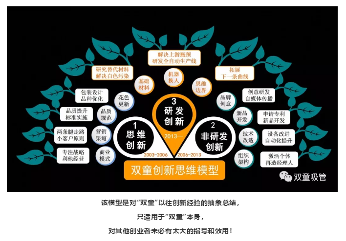 2003年開始,“雙童”提出了“兩條腿走路戰(zhàn)略”和“小客戶原則”,走差異化轉(zhuǎn)型路線,進(jìn)行思維創(chuàng)新。同時,“雙童”通過技術(shù)改造、新品開發(fā)、品牌創(chuàng)意等開展非研發(fā)創(chuàng)新工作,通過打開思維邊界、機(jī)器換人、研發(fā)可降解產(chǎn)品等開展研發(fā)創(chuàng)新,從而促進(jìn)和推動企業(yè)的發(fā)展!