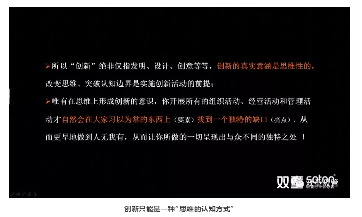 由此我們得出一個結(jié)論:“創(chuàng)新”絕非僅指發(fā)明、設(shè)計(jì)、創(chuàng)意等,創(chuàng)新是一種“思維的認(rèn)知方式”,在大家都習(xí)以為常的東西上,找到一個獨(dú)特的缺口,從而更早地做到“人無我有”。