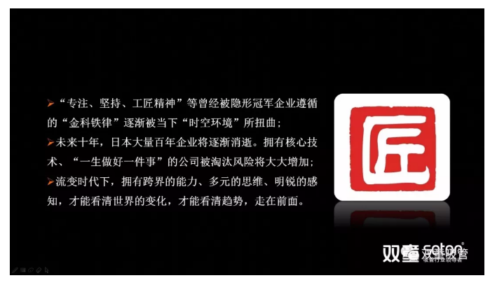 樓仲平分享道:“工匠精神”來源于日本,是一種骨子里的敬業(yè)和守業(yè)精神。它是日本民族中人格文化的體現(xiàn),完全靠學是學不會的?!肮そ尘瘛眰魅胫袊?,通過政府、社會的推動已經成為一種口號、一項運動、一種共識。我們要意識到任何一項事物一旦被社會所號召,如果創(chuàng)業(yè)者沉迷其中,就沒有企業(yè)經營中的差異化所在。