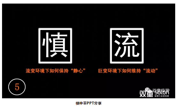 第二個字是“流”。在高速變化的時代,資源和信息高速流變,人才高度流動……在這樣的大環(huán)境下,企業(yè)發(fā)展呈現(xiàn)出一種不可預測的情況。作為行業(yè)細分的領先企業(yè),你應該通過主動的方式、迎合的方式、應變的方式、創(chuàng)新的方式,從而保持企業(yè)有序流動,保持創(chuàng)新。