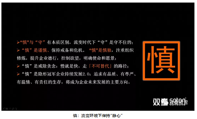 其實,“慎”跟“守”有本質區(qū)別。流變時代下,“守”是守不住的?!吧鳌?,對企業(yè)來說是要認識到這個時代給我們帶來的巨變沖擊,并知道自己的不足和短板。所以,“慎”是保持謹慎、戒備和危機。
