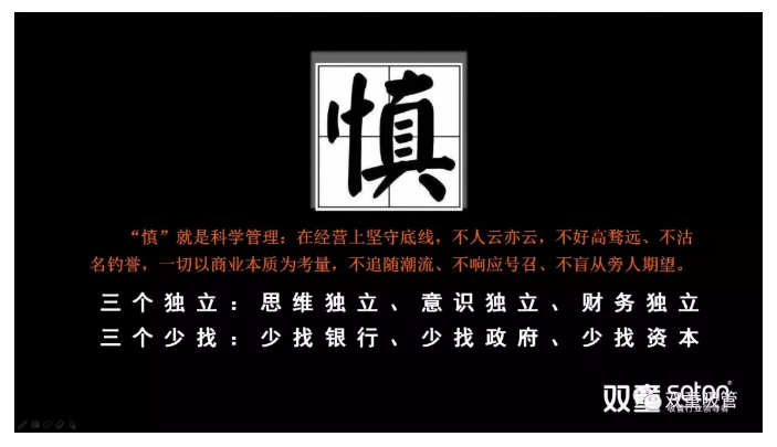 更深層次講,“慎”是慎獨,也就是說中國經濟發(fā)展到今天,企業(yè)在發(fā)展過程中不能像粗放時期一樣完全追求規(guī)模、追求占有、追求薄利多銷……