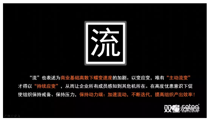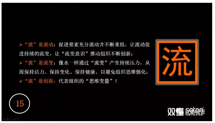 “流”在更深層次上也可以理解為創(chuàng)新,它代表組織的“思維變量”。它是在商業(yè)基礎流變下迭代速度的加速,我們要以變應變,用“主動流變”去維持“持續(xù)應變”,從而讓企業(yè)所有成員感知到其危機所在。在高度憂患意識下,“流”促使了組織保持戒備、保持壓力,加速流動,不斷迭代,從而提高組織的產出效率!