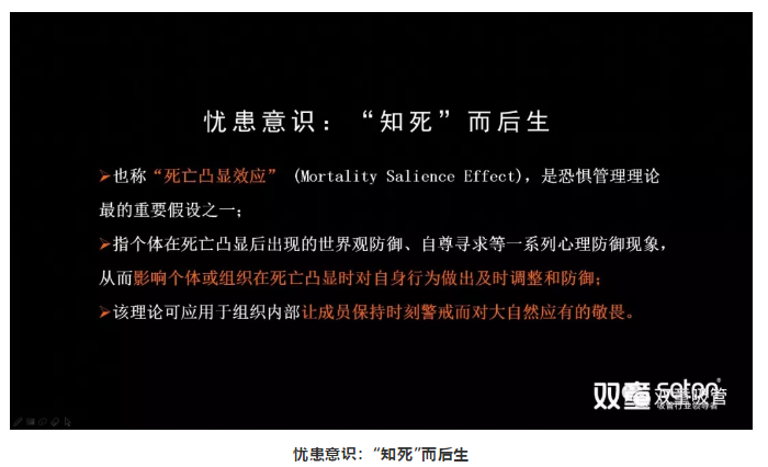 舉個例子。人類是所有動物當中唯一知道自己要死的動物,從而對自己的死有所準備、有所意識、有所恐懼,有所戒備,從而更早地讓我們有干預,讓我們去迎合和改變。這樣一種“死亡凸顯效應”就叫“知死而后生”。