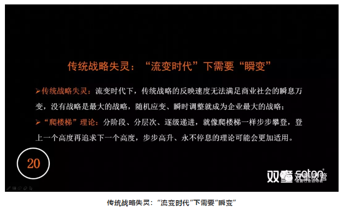另一個觀點,我認為在一個流變的時代下,由于信息的高速迭代,傳統(tǒng)戰(zhàn)略已經失靈。意思就是在流變時代下,傳統(tǒng)戰(zhàn)略的反映速度無法滿足商業(yè)社會的瞬息萬變。所以,沒有戰(zhàn)略有可能是企業(yè)最好的戰(zhàn)略。