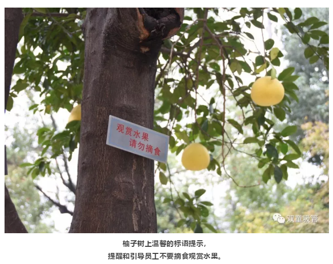 原來,為了“雙童”的生態(tài)和美觀,公司明確柚子是觀賞性水果,每棵柚子樹上都有“觀賞水果,請勿摘食”的字樣,提醒和引導(dǎo)員工不要摘食觀賞水果。