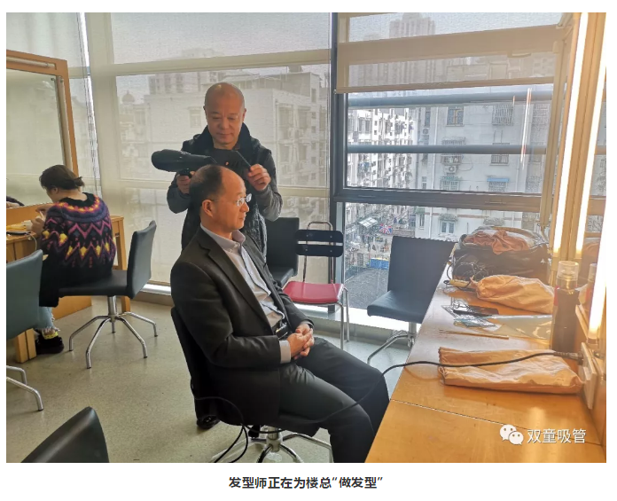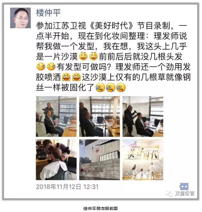 在節(jié)目錄制前,“雙童”樓仲平正在整理發(fā)型妝容,理發(fā)師說幫樓大大做個發(fā)型,吸管妞在一邊吐槽:樓總這發(fā)型有啥好整理的?圖中的“光頭”發(fā)型師回嘴:那還是要的,樓總頭發(fā)比我多!樓總也樂了:“我這頭上幾乎是一片‘沙漠’,還是你頭發(fā)多!”