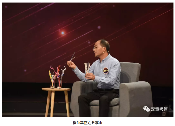 在“雙童”樓仲平上場后,主持人趙丹軍就被桌子上的各類吸管所吸引啦!樓仲平也向在場觀眾介紹了美觀環(huán)保的可降解吸管和極具特色的創(chuàng)新吸管。