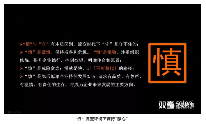 其次,“慎”是慎獨(dú)。也就是中國經(jīng)濟(jì)發(fā)展到今天,企業(yè)在發(fā)展過程中不能像粗放時(shí)期一樣完全追求規(guī)模、追求占有、追求薄利多銷…… 我們要追求的是一個(gè)有品質(zhì),有尊嚴(yán),有溫情,有責(zé)任的“生”,這四個(gè)“有”是“雙童”在二十多年發(fā)展過程中逐漸體現(xiàn)出來的。