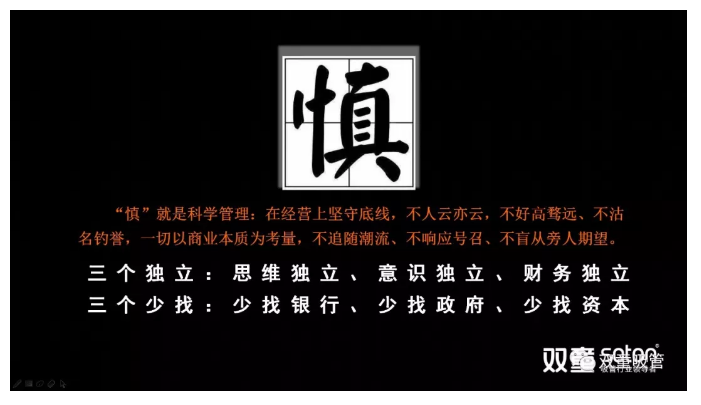 最后,“慎”也是科學(xué)管理的本真,我們要有自己獨(dú)立的思維,在經(jīng)營(yíng)上要有自己的獨(dú)立判斷,堅(jiān)守底線,不人云亦云,一切以商業(yè)本質(zhì)為考量,不追隨潮流、不響應(yīng)號(hào)召、不盲從旁人期望?;谝陨?,樓仲平總結(jié)出“三個(gè)少找”和“三個(gè)獨(dú)立”: