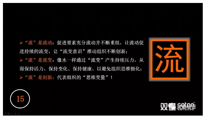 首先,“流”代表的是在高速變化的時(shí)代下,資源和信息高速流變,人才高度流動(dòng)……我們要通過主動(dòng)的方式、迎合的方式、應(yīng)變的方式、創(chuàng)新的方式,從而保持企業(yè)有序流動(dòng),保持創(chuàng)新。