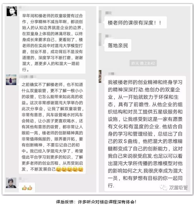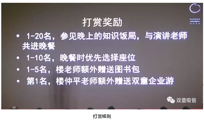 不知不覺分享也到了尾聲,在場聽眾卻依舊意猶未盡,空前的學習氛圍,讓每一個人都沉浸在這場思維的盛宴中!在樓仲平分享之后,同學們開啟了瘋狂打賞模式,想與樓總有進一步交流。晚上的知識飯局,樓仲平則成了“香餑餑”,成為了大家爭先交流的對象。
