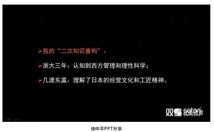 首先,樓仲平在完成原始知識積累后,1998年在浙大學習期間進行了第二次知識重構(gòu),積累了不少管理理念和商業(yè)知識。在“二次知識重構(gòu)”期間,他逐漸意識到自己需要脫離原來圈子,努力向知識界和學術(shù)界靠攏,從而獲得經(jīng)驗之外的知識,看到感官之外的原理和邏輯。