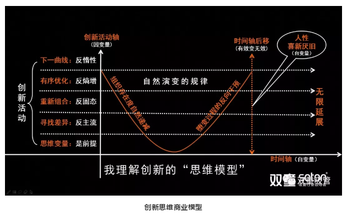 在“創(chuàng)新思維商業(yè)模型”中,X軸是時間軸,屬于自變量。Y軸是創(chuàng)新深度軸,屬于因變量。創(chuàng)新是對大自然宇宙演化中一種自然規(guī)律的干預,而這種自然規(guī)律的本質(zhì)是組織存在“自然遞減”的墮變過程,要想改變自然規(guī)律,就必然進行不斷地調(diào)整和干預,從而讓組織從“下墮”走向“上揚”,否則將會一直處于遞減的狀態(tài)……