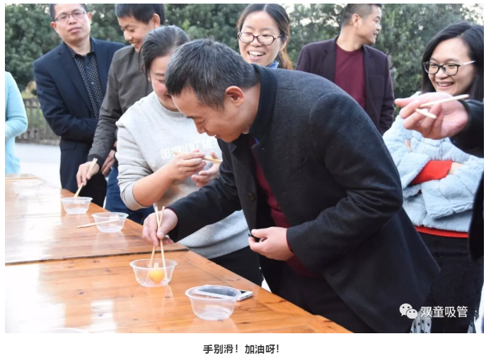 熱身活動過后,迎來了“夾乒乓球”大賽。每個(gè)小組的隊(duì)員依次夾起乒乓球放入下一個(gè)人碗中,直到所有球都傳到最后一個(gè)人手中,率先完成的小組獲勝!