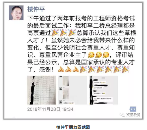 在政策的引領(lǐng)下,在樓仲平不斷突破,不斷精進(jìn)下,樓仲平順利通過了工程師評審。他也欣喜表示:“雖然這未必會給我?guī)硎裁礃拥淖兓?,但至少說明社會尊重人才、尊重知識、尊重民營企業(yè)主了,總算是國家承認(rèn)的專業(yè)人才了!”