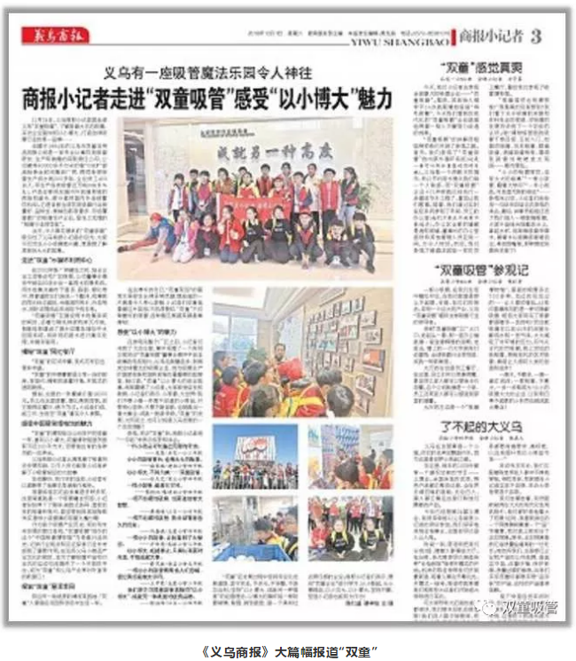 火了!火了!“雙童”又火了!近日,《義烏商報》的小記者團(tuán)來到“雙童”參觀,感受雙童“以小博大”魅力。參觀結(jié)束后,《義烏商報》對這座吸管魔法樂園進(jìn)行了大篇幅報道,究竟小記者們眼中的“吸管魔法樂園”有何魔力呢?快跟著吸管妞一起來看看吧!