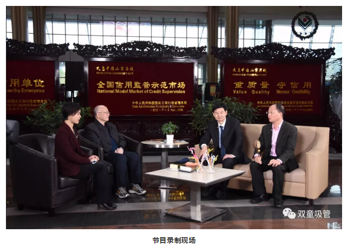 12月6日,金華電視臺(tái)改革開(kāi)放40周年專(zhuān)題節(jié)目“騰飛”篇章在義烏國(guó)際商貿(mào)城四區(qū)錄制。“雙童”樓仲平受邀與主持人賀爭(zhēng)怡、浙江師范大學(xué)經(jīng)濟(jì)與管理學(xué)院院長(zhǎng)陸立軍教授、浪莎集團(tuán)總裁翁榮弟先生同臺(tái)親密互動(dòng)。