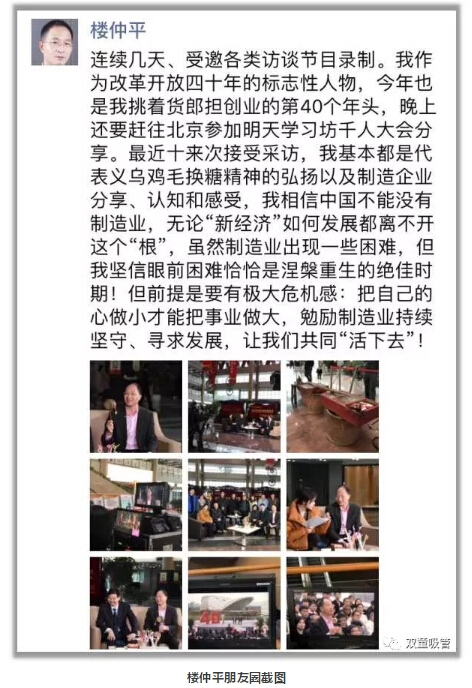 節(jié)目錄制結(jié)束之后,樓仲平也在朋友圈感言:連續(xù)幾天、受邀“改革開(kāi)放40周年”訪(fǎng)談節(jié)目,我基本都是代表義烏雞毛換糖精神的弘揚(yáng)以及制造企業(yè)分享、認(rèn)知和感受,我相信中國(guó)不能沒(méi)有制造業(yè),無(wú)論“新經(jīng)濟(jì)”如何發(fā)展都離不開(kāi)這個(gè)“根”,雖然制造業(yè)出現(xiàn)一些困難,但我堅(jiān)信眼前困難恰恰是涅槃重生的絕佳時(shí)期!但前提是要有極大危機(jī)感:把自己的心做小才能把事業(yè)做大,勉勵(lì)制造業(yè)持續(xù)堅(jiān)守、尋求發(fā)展,讓我們共同“活下去”!