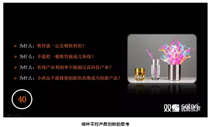 吸管在傳統(tǒng)認(rèn)知中是典型的“低、小、散、弱”的小商品!但樓仲平偏偏不信這個(gè)邪,從2003年之后,他逐漸開始“不務(wù)正業(yè)”思考“產(chǎn)品 Vs 商品”的關(guān)系,從而引發(fā)思考: