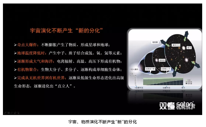 接下來,樓仲平通過宇宙演化的例子讓大家對(duì)創(chuàng)新有更深的理解:宇宙起源于奇點(diǎn)大爆炸,通過宇宙的演化不斷產(chǎn)生新的物質(zhì),繼而形成星球和地球,產(chǎn)生有機(jī)物及生命,形成不斷“新”的分化。