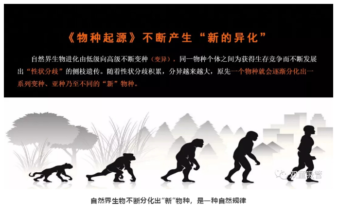 隨后,樓仲平也同樣用達(dá)爾文的《物種起源》作為案例,在物種演化的過程中,不斷產(chǎn)生測(cè)枝遺傳,隨著性狀分歧積累,分異越來越大,從而不斷產(chǎn)生“新”的物種!