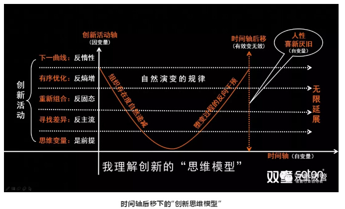 在自變量的時(shí)間軸中,隨著時(shí)間后移,人性中的“喜新厭舊”發(fā)生作用,創(chuàng)新有效變無效,從而需要持續(xù)創(chuàng)新,無窮無盡……