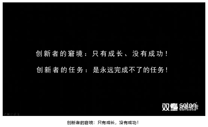 所以,創(chuàng)新是創(chuàng)業(yè)活動(dòng)的“應(yīng)變反饋”,是“墮變過程”的“反向調(diào)整”。創(chuàng)新者的任務(wù)是永遠(yuǎn)完成不了的任務(wù),只要?jiǎng)?chuàng)業(yè)持續(xù),創(chuàng)新就需要“無限延展”!創(chuàng)新者的窘境在于只有成長(zhǎng),沒有成功!