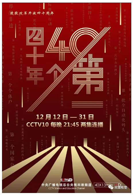 央視《四十年四十個(gè)第一》紀(jì)錄片包含40集,每集13分鐘。節(jié)目講述了中國第一個(gè)個(gè)體戶、第一批農(nóng)村萬元戶、第一批小商品市場、第一座高架橋、第一家個(gè)體飯店、第一家卡拉OK廳、第一部國產(chǎn)電視連續(xù)劇、第一所希望小學(xué)、第一屆春晚、第一次極地科考、第一艘載人深潛器等背后的故事,通過聚焦40年來人們發(fā)生的若干個(gè)“第一”反映四十年來發(fā)生在中國大地的滄桑巨變,喚起觀眾對過去的回憶以及對美好生活的向往!
