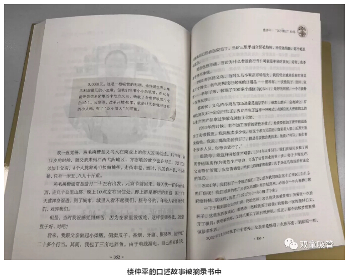 其中,樓仲平作為義烏企業(yè)界的代表,自身的創(chuàng)業(yè)經(jīng)歷伴隨著改革開(kāi)放40年的發(fā)展,在書中分享了小人物“以小博大”的故事,其內(nèi)容被摘錄了整整十頁(yè)!