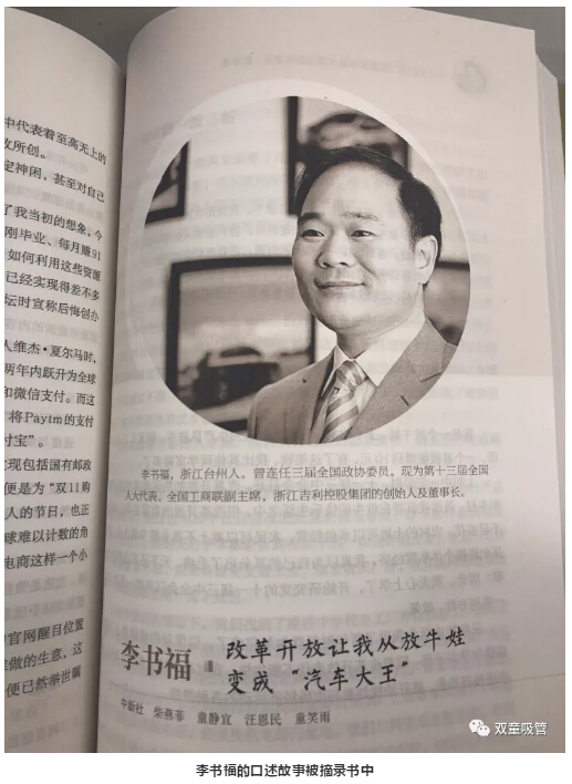 浙江吉利控股集團(tuán)創(chuàng)始人李書福,口述故事《改革開(kāi)放讓我從放牛娃變成“汽車大王”》被摘錄《浙江改革開(kāi)放40年口述歷史》一書中。