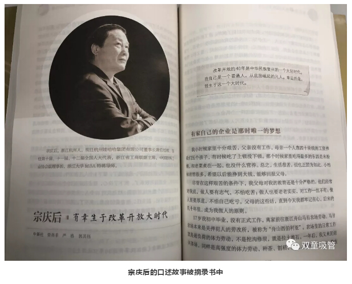 杭州娃哈哈集團(tuán)有限公司董事長(zhǎng)宗慶后,口述故事《有幸生于改革開(kāi)放大時(shí)代》被摘錄《浙江改革開(kāi)放40年口述歷史》一書中……