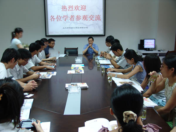 2007年7月27日在義烏市人才交流中心余科長(zhǎng)的帶領(lǐng)下,清華、人大博士研究生13人來(lái)我司參觀交流。公司張國(guó)俊副總對(duì)學(xué)者們的到來(lái)致歡迎詞,并對(duì)學(xué)者們的提問(wèn)做了一一解答和交流。公司辦公室主任盧程航做了熱情接待,對(duì)公司情況做了詳細(xì)介紹,并陪同學(xué)者們?cè)趩T工寢室、車間等廠區(qū)進(jìn)行了參觀。