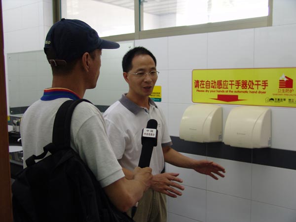 上圖為公司董事長樓仲平先生(圖左)在解說雙童公司特有的“廁所文化”