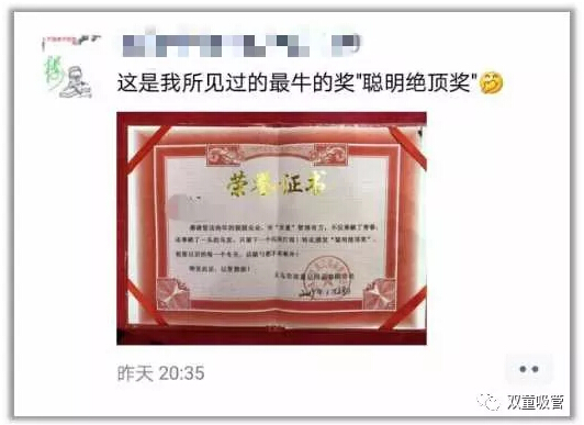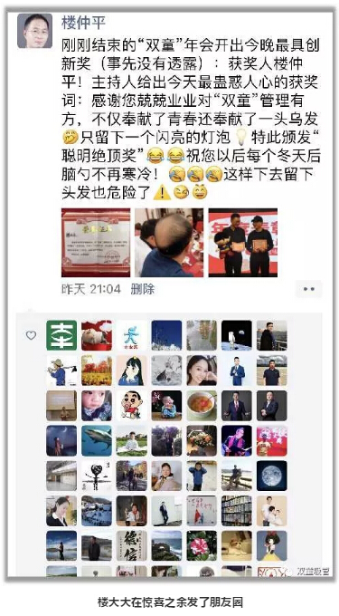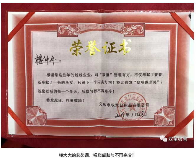 榮譽證書:樓仲平,感謝您這些年的兢兢業(yè)業(yè),對“雙童”管理有方,不僅奉獻(xiàn)了青春,還奉獻(xiàn)了一頭的烏發(fā),只留下一個閃亮的燈泡!特此頒發(fā)“聰明絕頂獎”,祝您以后的每一個冬天,后腦勺不再寒冷!